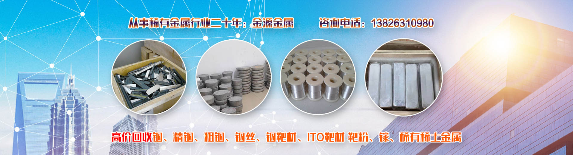 韶關市金源金屬材料有限公司坐落于中國廣東省韶關市,長期收購回收銦、精銦、粗銦、銦絲、銦靶材、ITO靶材靶粉、回收金屬鍺、鍺錠、鍺粉、鍺片、回收鍺單晶、單晶鍺、鍺粒、區(qū)熔鍺、工業(yè)鍺、廢鍺、鍺泥、鍺渣、二氧化鍺回收、四氯化鍺、有機鍺、銀、純銀、銀靶材、高價收購回收ITO廢靶、回收廢銦、廢銦沙、廢銦渣、回收粗銦、廢銦絲、廢銦珠、廢銦箔、廢銦棒、收購銀焊條、銀焊絲、導電銀膠、金屬鎵、硝酸鎵、氧化鎵、三氯化鎵、氯化鎵,供應及回收氧化鎵、氫氧化鎵、碲化鎵,硒化鎵,銦粉,氧化銦、氯化銦、硫酸銦、硫化銦、醋酸銦、氫氧化銦、硒化銦,碘化銦,銅銦鎵硒,含金、銀、銦、銠、鈀、鎵、鍺等稀有貴金屬材料,稀土金屬材料、氧化鏑、氧化镥、氧化鋱、氧化鐠釹等回收。
